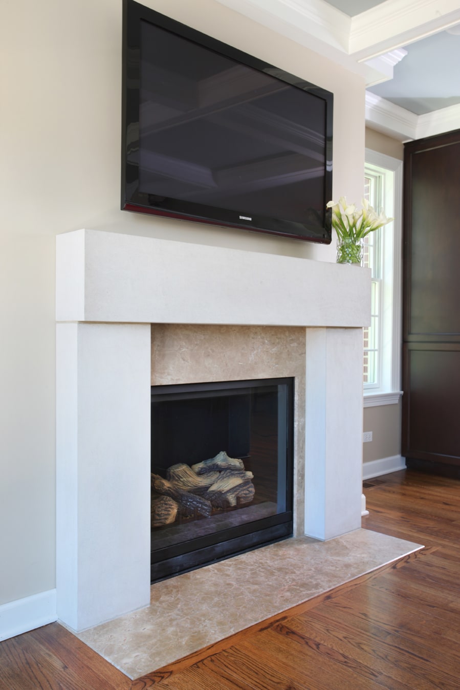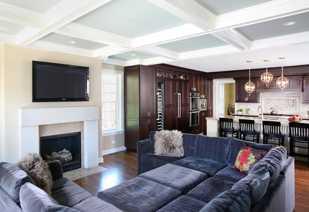 Also, the wife (being the only lady of the household) desired a master bedroom suite with a luxury bathroom to serve as her “escape.” Those requests among others, led to the final result of a two-story addition, with a full basement.The entry to the addition welcomes you into a great room with a coffered ceiling, with a simple but charming fireplace as the focal point.