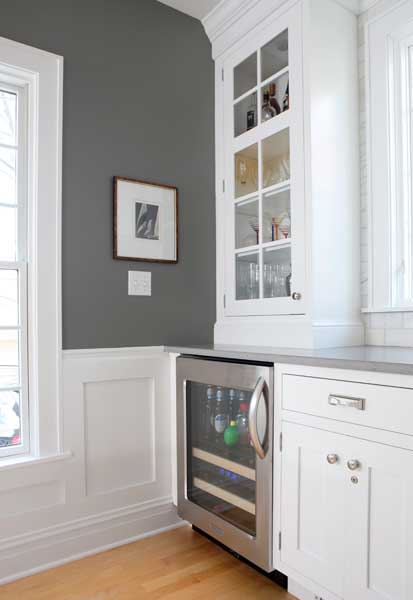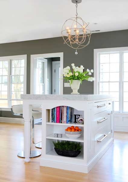 The walls are painted in Benjamin Moore’s Chelsea gray, and add a soothing effect to the whole space. The white cabinets create a striking contrast, The walls are painted in Benjamin Moore’s Chelsea gray and add a soothing effect to the whole space. The white cabinets create a striking contrast, which keeps the space looking bright instead of dull. “White cabinets are a huge kitchen trend for 2012; they have a timeless look that will never get old,” says Stephanie, “Combining the crisp, white cabinetry with the soothing gray was a simple combination with a stunning result.” To accent the rest of the kitchen, softer grays were chosen for the countertops and backsplash. “I didn’t want to take away from the simple color scheme, rather, I wanted to contribute to it,” commented Stephanie, ”Incorporating a soft gray was a middle ground to gracefully transition the bright whites and the soothing grays.”