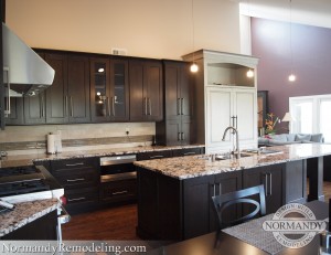A defined focal point came about in a refrigerator by Sub Zero that looked like a unique furniture piece. The homeowners absolutely loved Kathryn’s selection of a metallic silver finish with a black flecking, which perfectly complemented the dark perimeter cabinets.