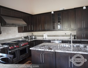 The homeowners met with Normandy Designer Kathryn O’Donovan, and they hit it off right away, getting caught up in what was soon to be their family’s ideal kitchen. “Changing up the work triangle and adding more preparation counter space was key to the success of this kitchen transformation,” commented Kathryn, “The existing kitchen perimeter wall was under utilized and in need of a new direction, so it made sense for it to house a range and work space, contributing to an overall efficient layout.” The approach for the homeowners’ lighting dilemma was to include a layered lighting effect; with recessed cans on the sloped ceiling for general light, under-cabinet lighting for task light and a couple more decorative, pendant lights to top off the space.