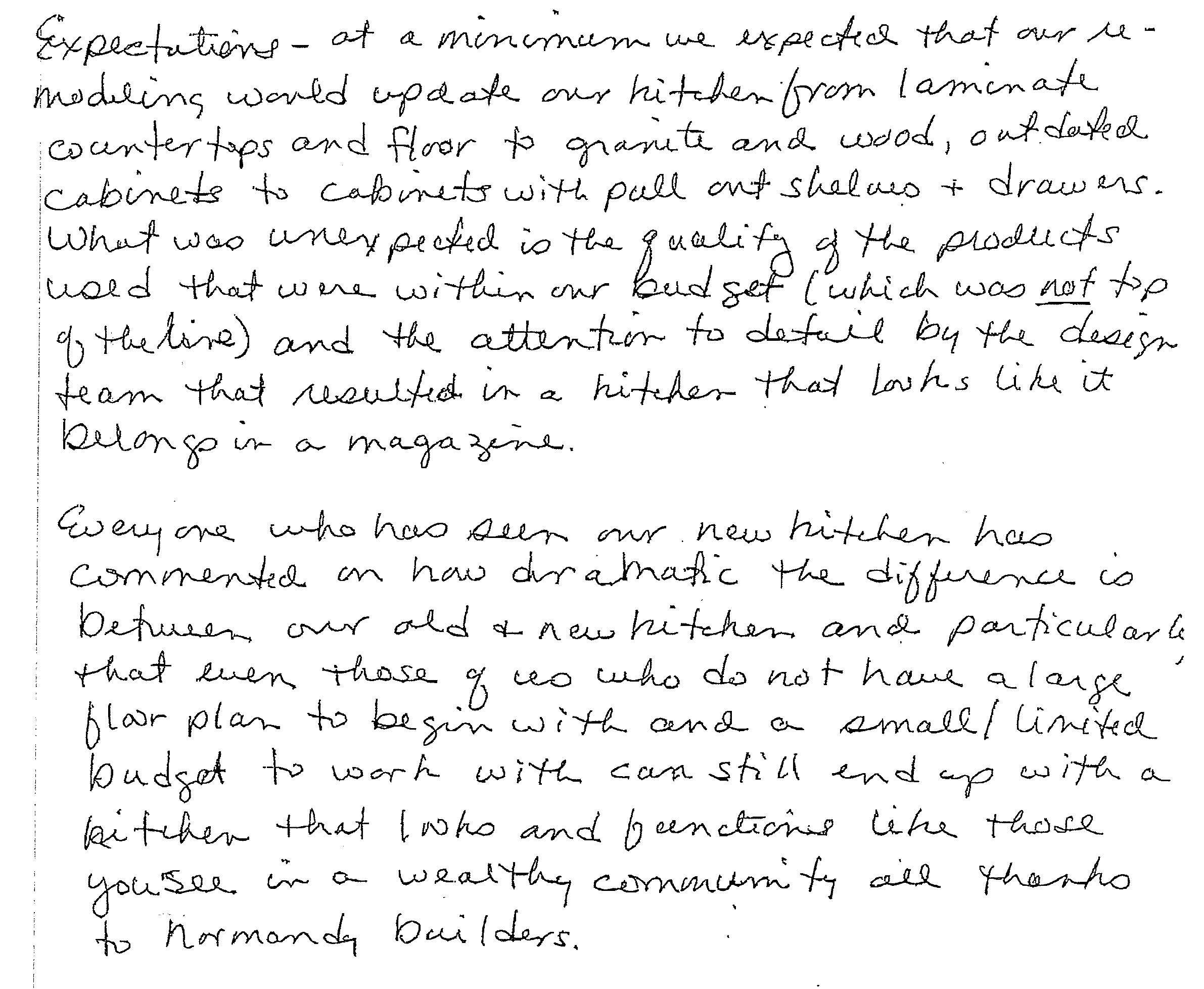 Everyone who has seen our new kitchen has commented on how dramatic the difference is between our old and new kitchen, and particularly that even those of us who do not have a large floor plan to begin with and a small/limited budget to work with can still end up with a kitchen that looks and functions like those you see in a wealthy community – all thanks to Normandy.”