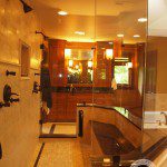 It features a luxurious shower with two sets of shower heads and body sprays, bench and shampoo niche. This master bath needed to be a retreat from the outside world enabling the homeowners to relax or get ready in the morning without bumping into each other. The bathroom also has matching vanities with plenty of storage, one on either side of the shower to continue with the “his and her” theme.