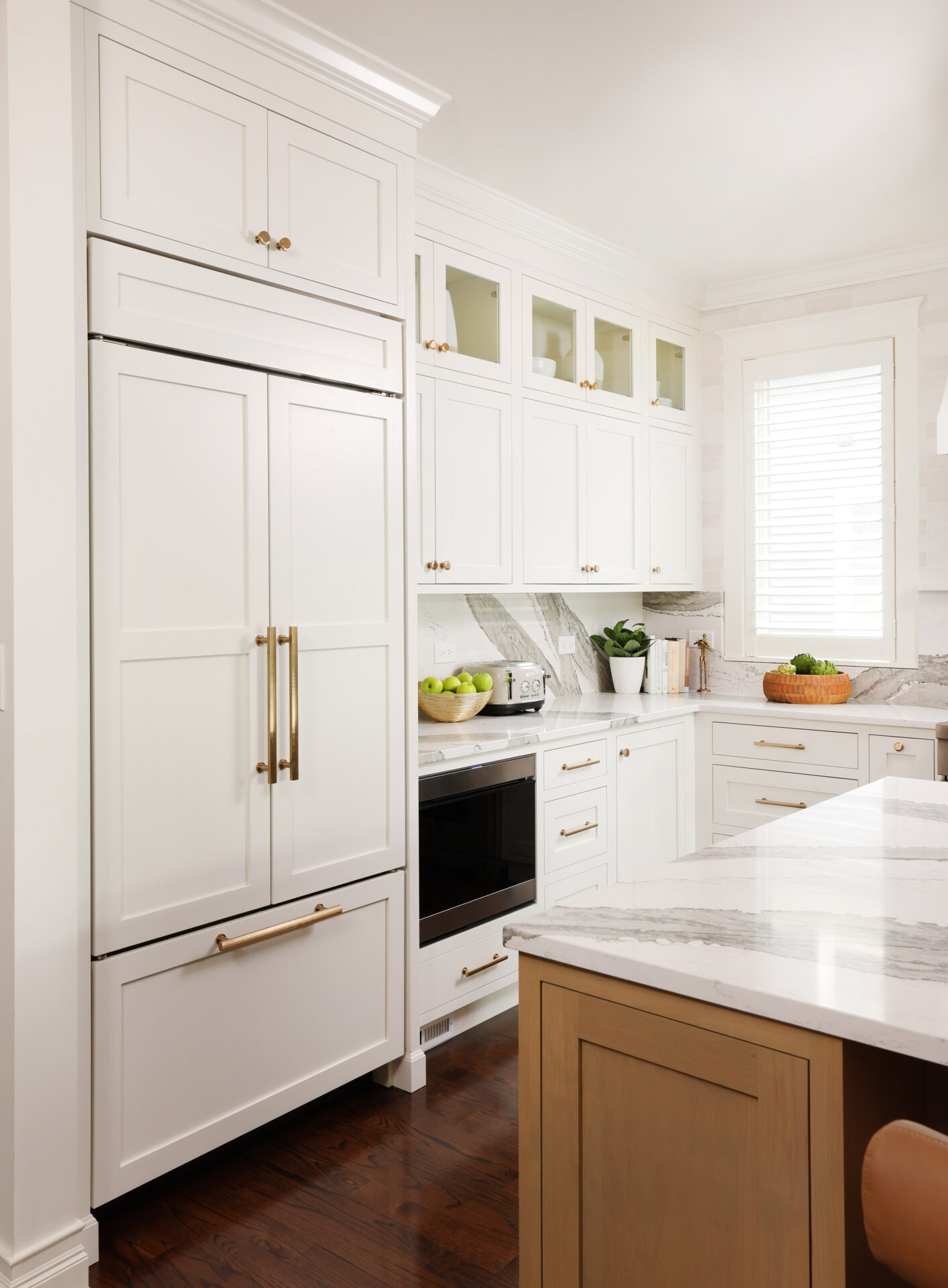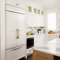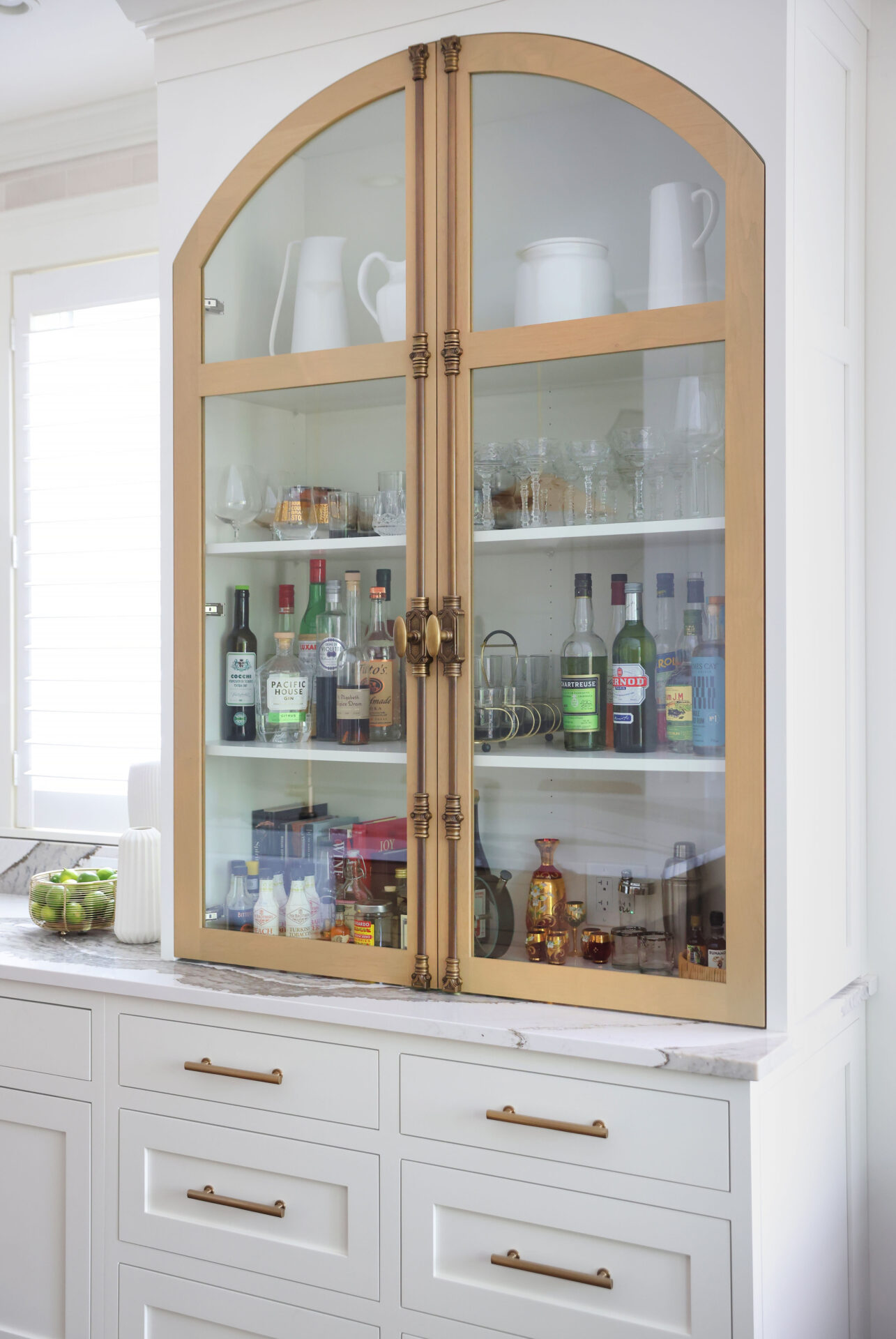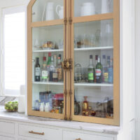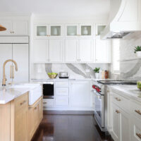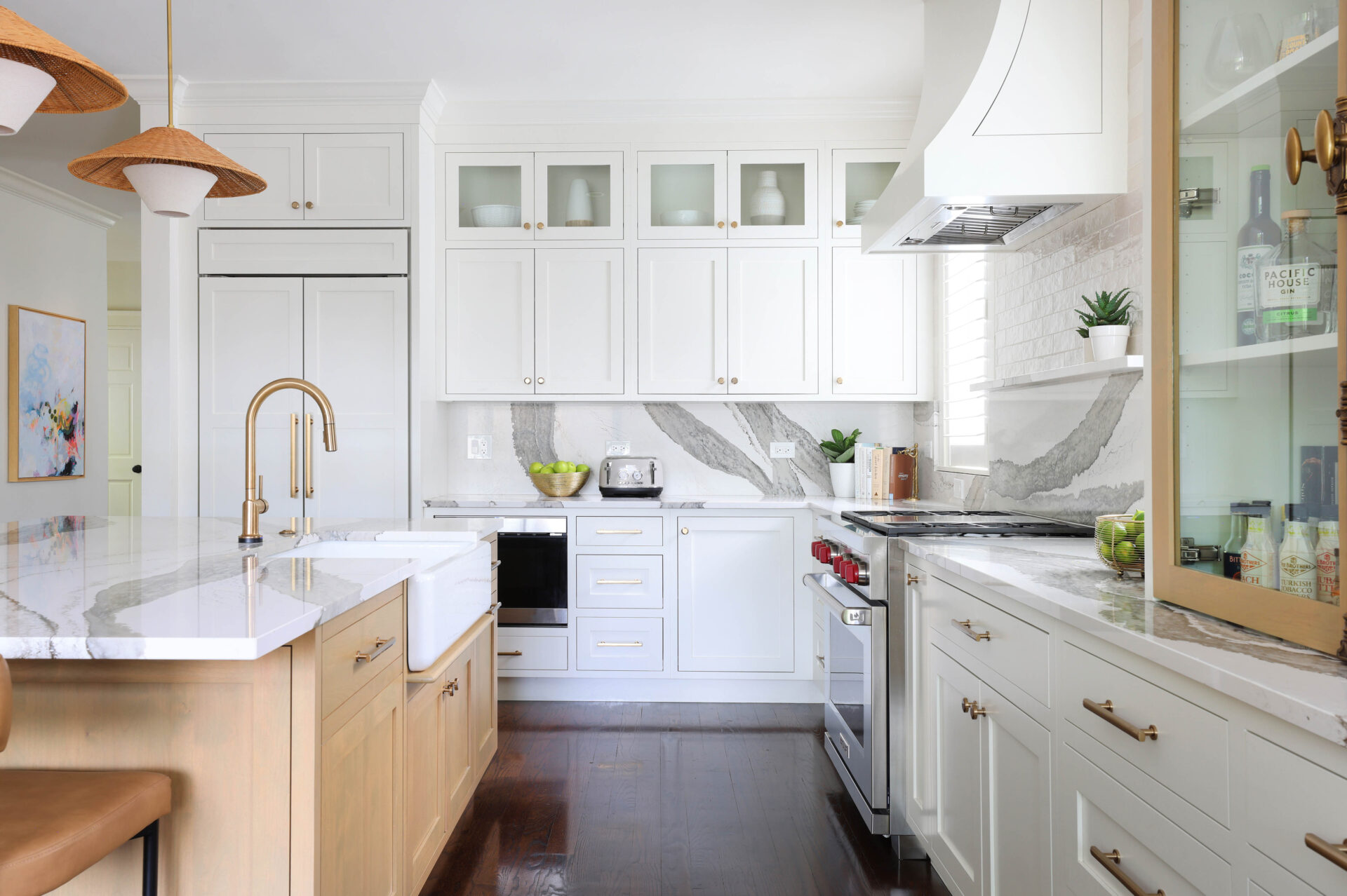 Modern living meets vintage charm in this updated kitchen remodel. A charming arched hutch, warm wood cabinetry, farmhouse sink, bold countertop and backsplash veining, and eclectic finishes add modern bohemian style to the spacious new floor plan.