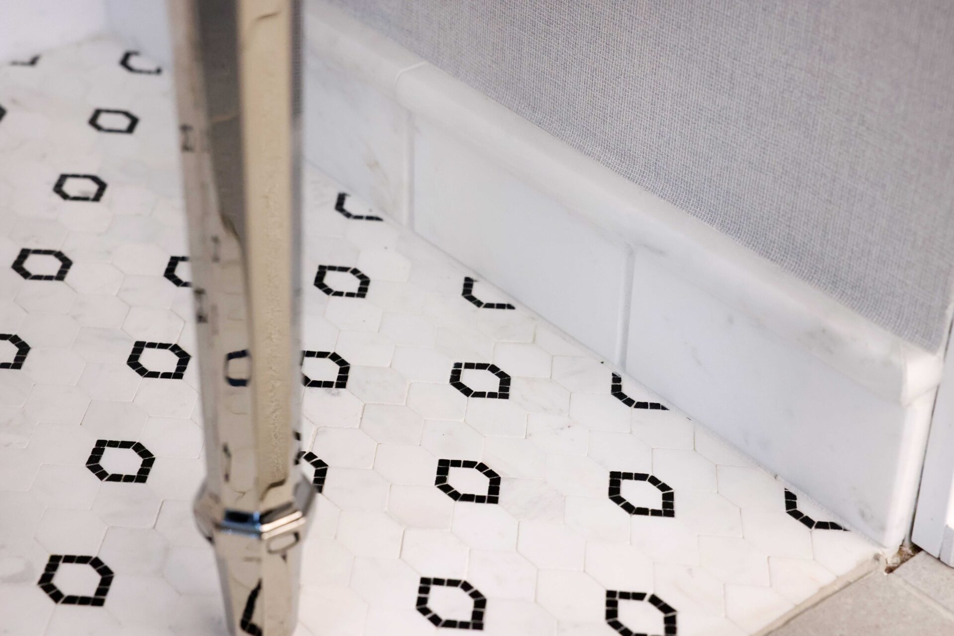 This black, white and gray powder room proves a simple palette can still feel luxurious. Marble surfaces, classic patterns, polished nickel and layered textures create depth and elegance, giving the small space a soft and sophisticated feel. See this luxury powder room at our Hinsdale Design Studio at 222 E Ogden Ave.