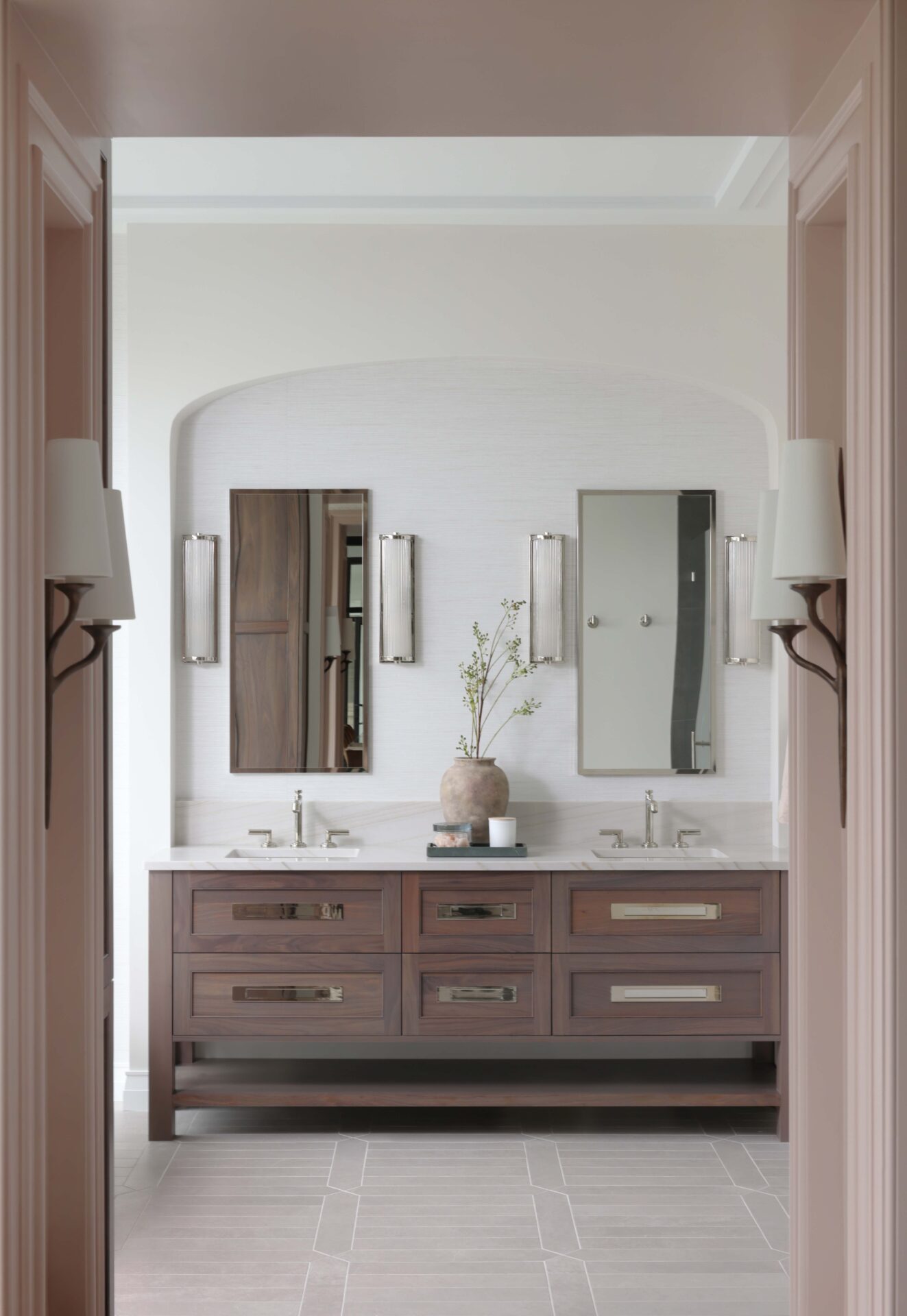 This bright primary bathroom blends classic and modern with ease. The arch and walnut console vanity set the stage. Quartzite countertops, polished nickel fixtures and a sculptural volcanic-stone freestanding tub keep the space calm, clean and timeless. See this modern classic primary bathroom at our Hinsdale Design Studio at 222 E Ogden Ave.